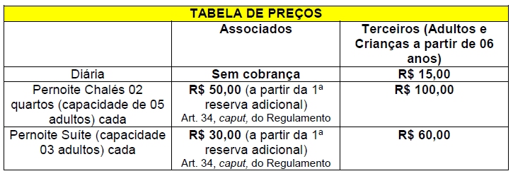 • Não será objeto de locação ou cessão sem ônus o clube nos feriados prolongados (superior ou igual – 03 dias, incluindo sábado e domingo) e no período de alta temporada (dezembro, janeiro, fevereiro e julho), nos termos do artigo 35, do Regulamento.